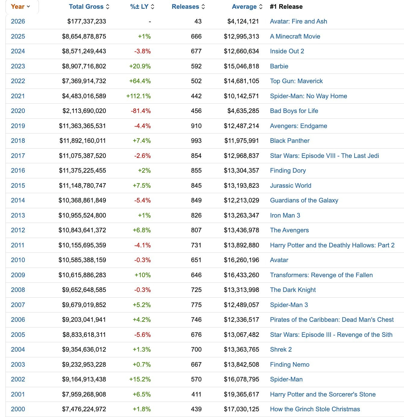 As I write this, Fire and Ash is the top grossing movie of 2026. Say what you will about its derivative plot, Avatar, the first entry in the series, is the only movie since 2000, besides Finding Nemo, to top the box office and not be a sequel or come from pre-existing intellectual property.