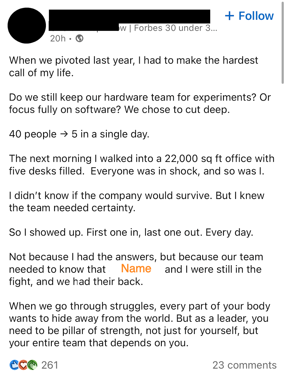 Above, the leader of a company lays off 35 people and valorizes himself, somehow. Steeled by Shaq, I responded: “Sorry laying off 35 people was so difficult on you.” My comment, the post’s first non-affirmational response, received nearly 200 likes and several supportive replies. Cowed into silence, the post was eventually removed. In the parlance of Shaq, Slam dunk.