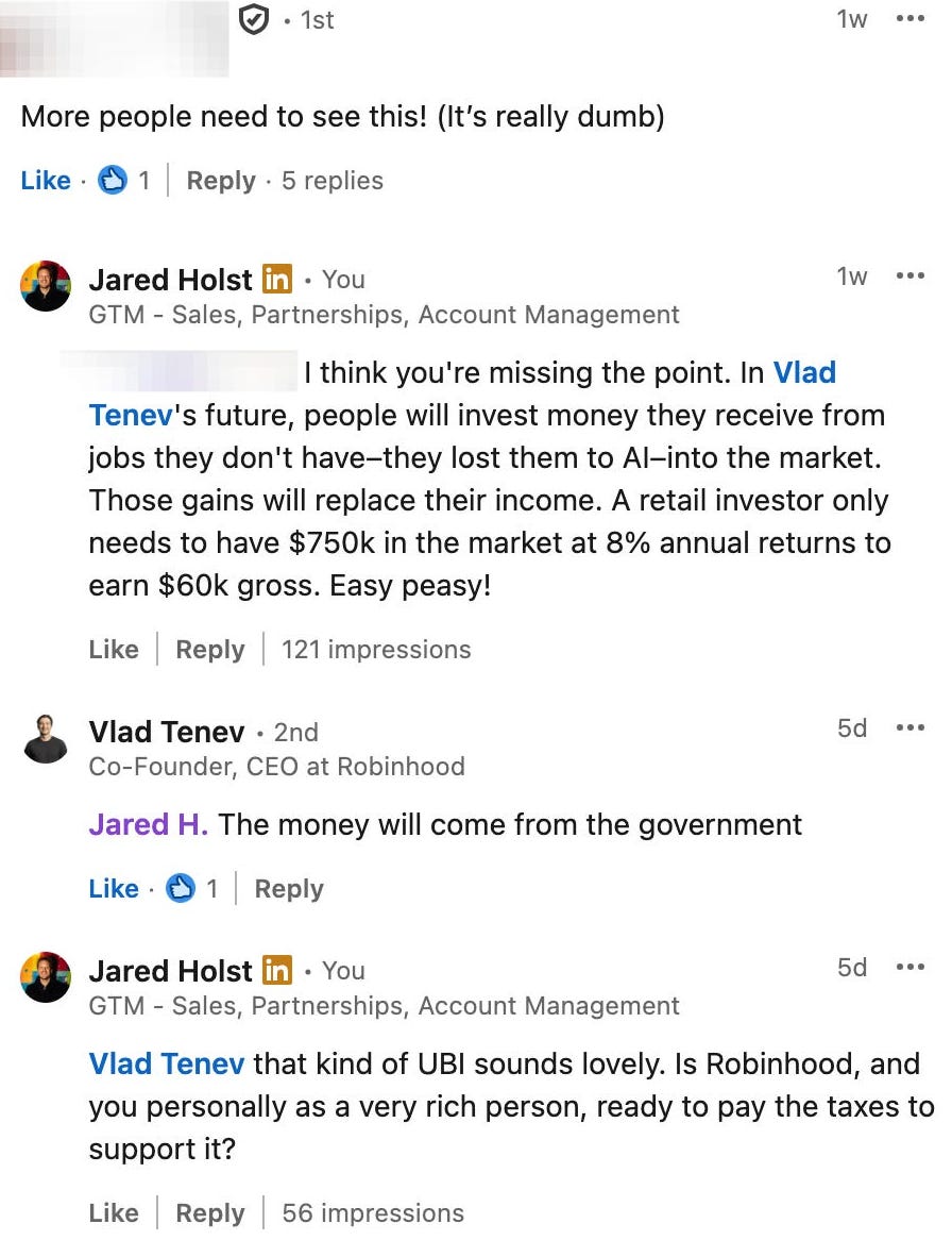 There are some questions we ask ourselves we never cease returning to. Mile markers of no discernible distance to remind us our thoughts often take us nowhere. Some are pleasurable, ‘What would I do if I won Powerball?’ Others hypothetical, ungradeable tests we give ourselves, ‘Would I put myself in danger to save people from a gunman, or a wayward semi-truck?’ Never having been in such a crucible, I test myself on the testable. ‘If I saw something stupid posted online by a person of power (in this case, the CEO of Robinhood), would I respond snarkily?’ I have passed. Once more in the parlance of Shaq, swish: